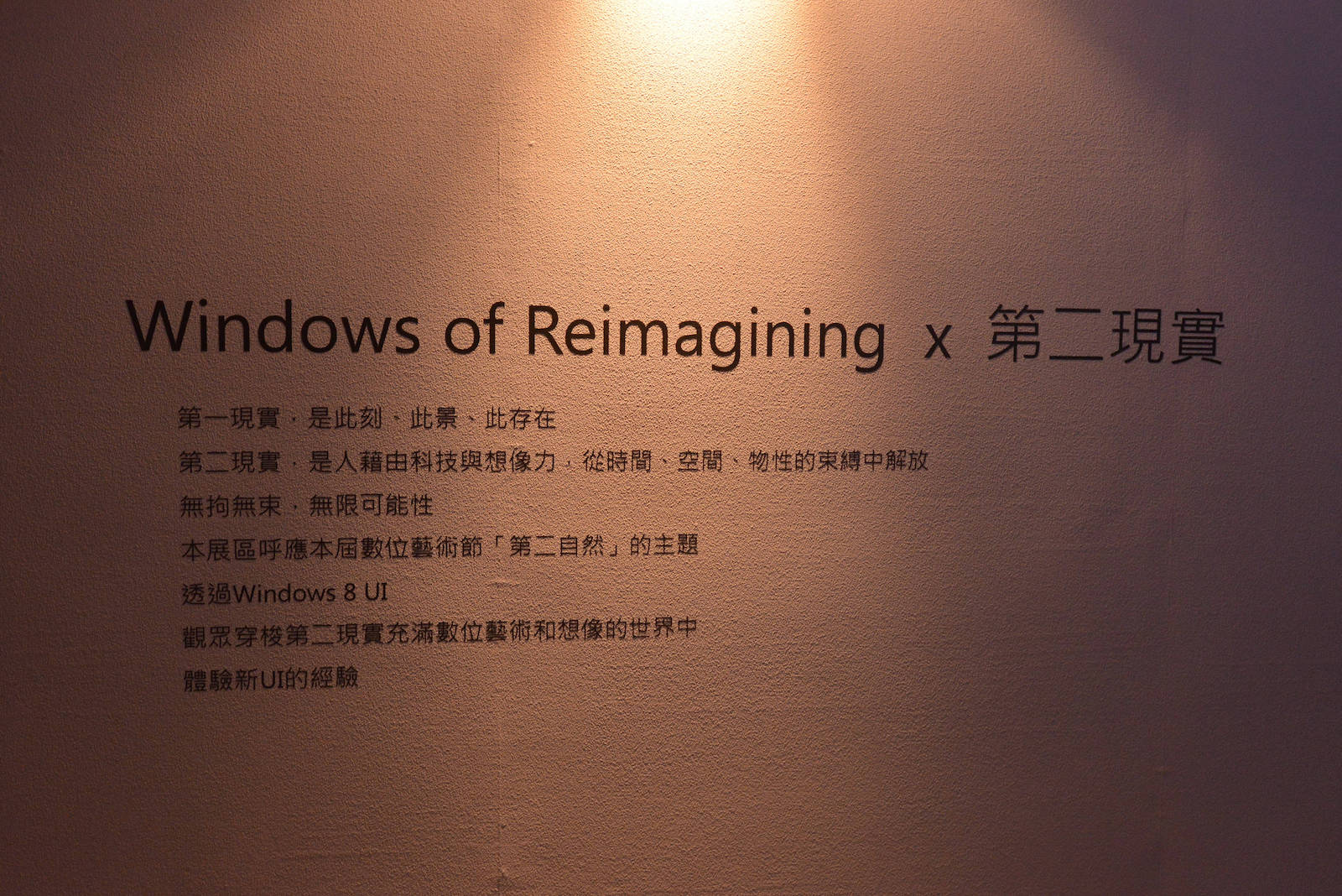 It is a project for Microsoft Taiwan. At the time Windows 8 just about to release, Microsoft Taiwan would like to promote their newst Operating System Windows 8 at an art festival in Taipei, Taiwan. We, therefore, created this art installation for Microsoft. In the installation, we used an All-In-One windows 8 computer to create an immersive and playable environment. While giving the audience a fun and special moment, they also experienced all of the new highlight features that comes with Windows 8.
