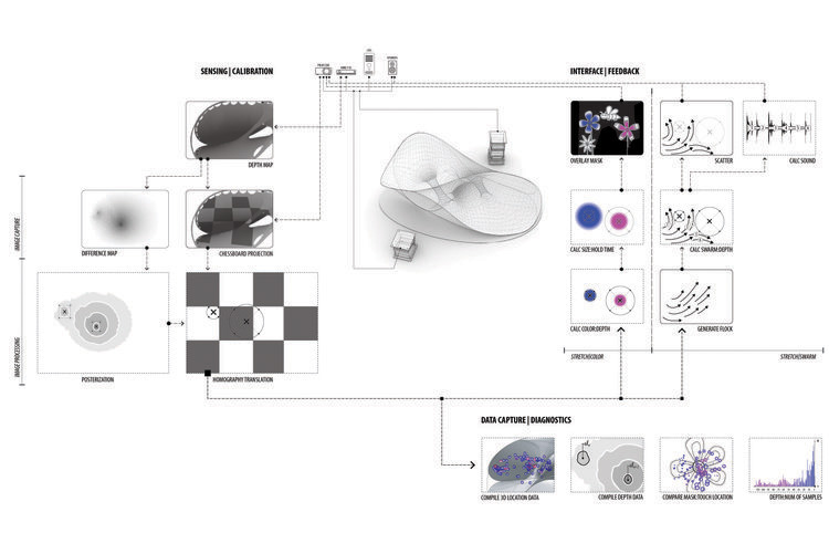 The software consists of two components: rendering and sensing. The rendering part is developed in Unity3D which embeds the visual and auditory interactivity through the use of projection. The rendering part is developed in Openframework and OpenCV with the depth information captured by Microsoft Kinect.